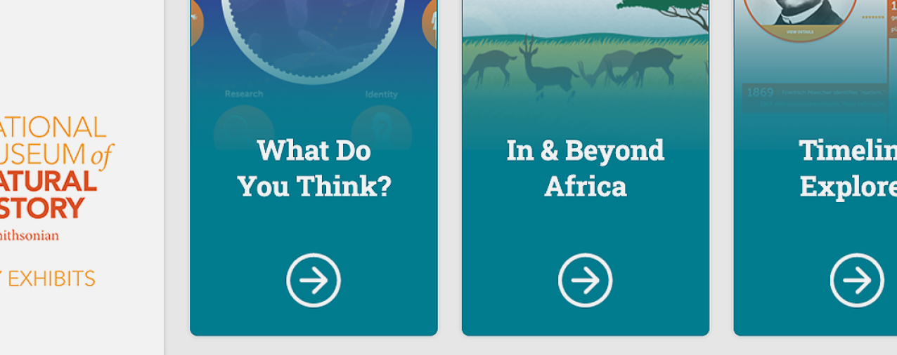The Genome DIY App allows users to interact with resources related to the free, print-on-demand exhibit that has been recreated from the traveling exhibition, Genome: Unlocking Life’s Code, by the Smithsonian’s National Museum of Natural History and National Institutes of Health’s National Human Genome Research Institute. Interactives include some of our most engaging timelines, What Do You Think? And In and Beyond Africa.