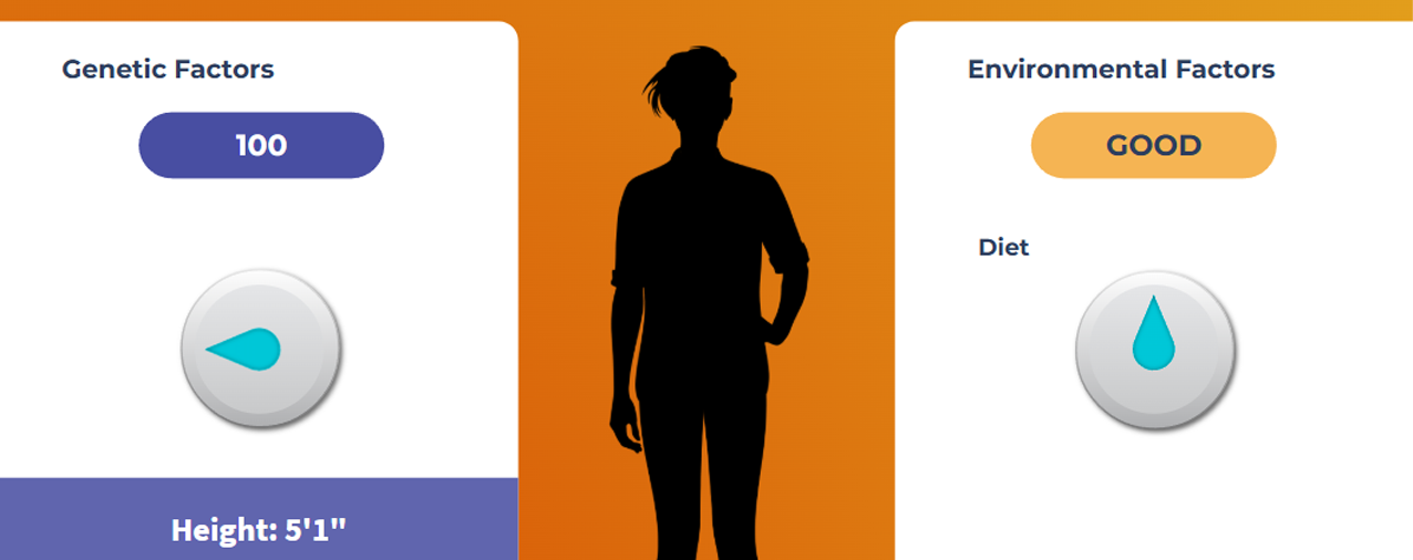 By turning two dials—one for genetic factors and one for environmental factors—users can explore how these elements combine to influence a person’s final height. The simulation illustrates this interaction using a figure that grows or shrinks depending on the chosen settings. This allows users to see that height is not determined by genes alone, but by a combination of both genetic makeup and environmental factors.
